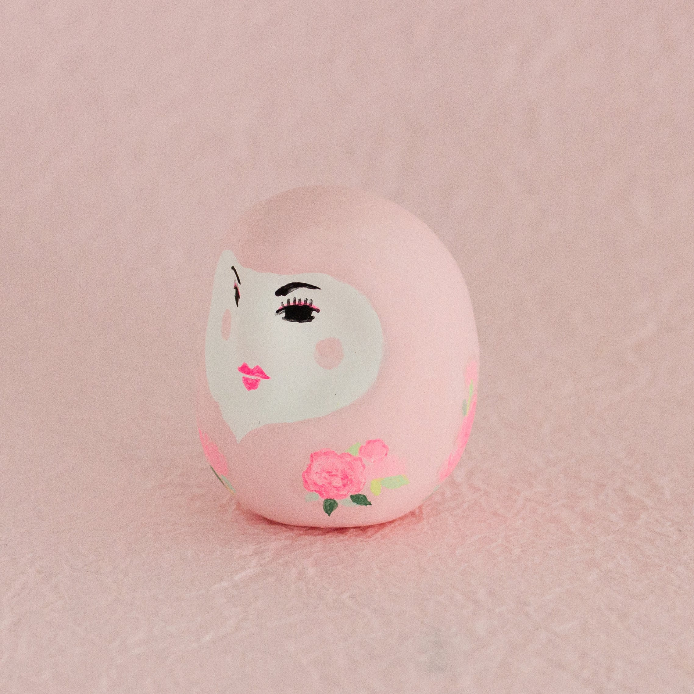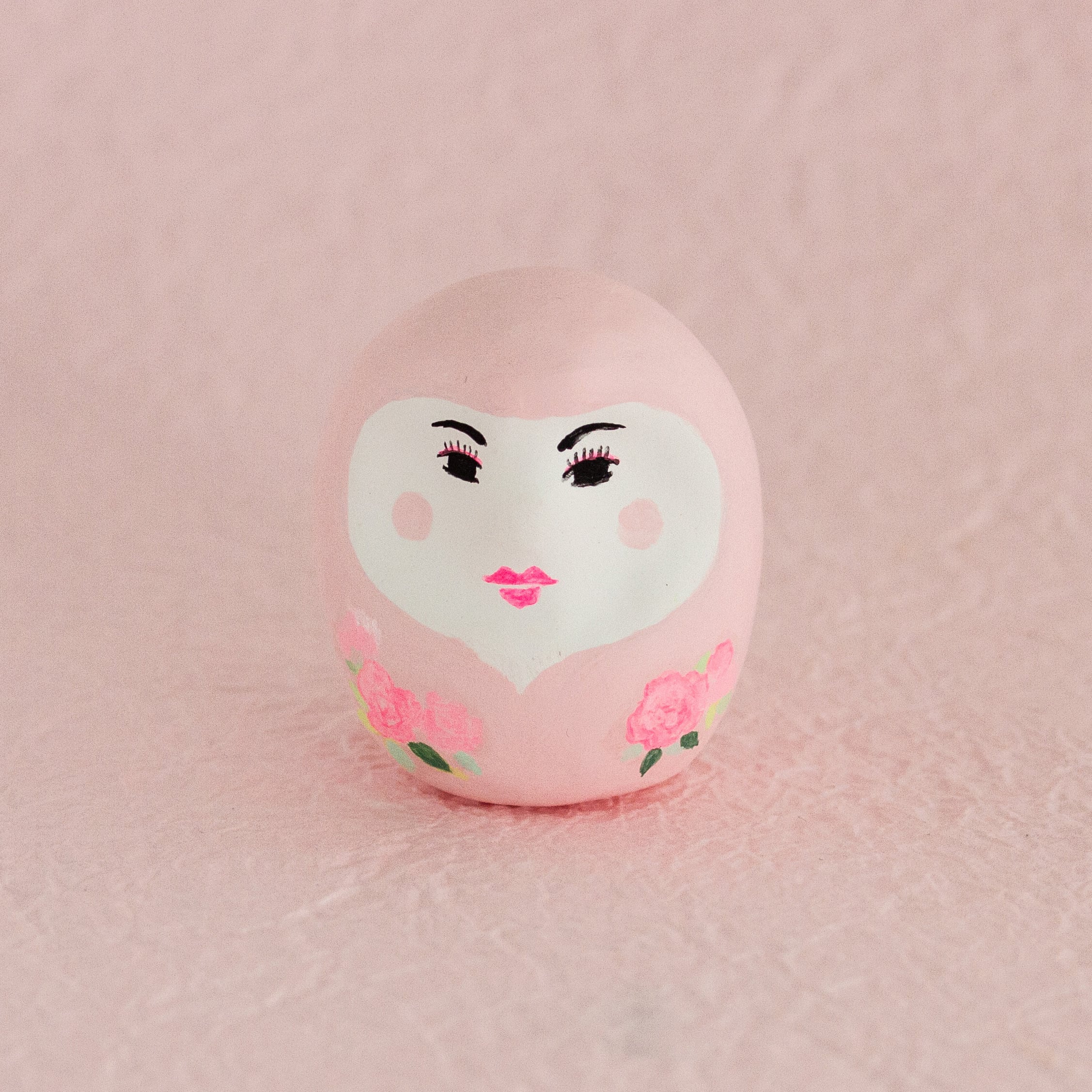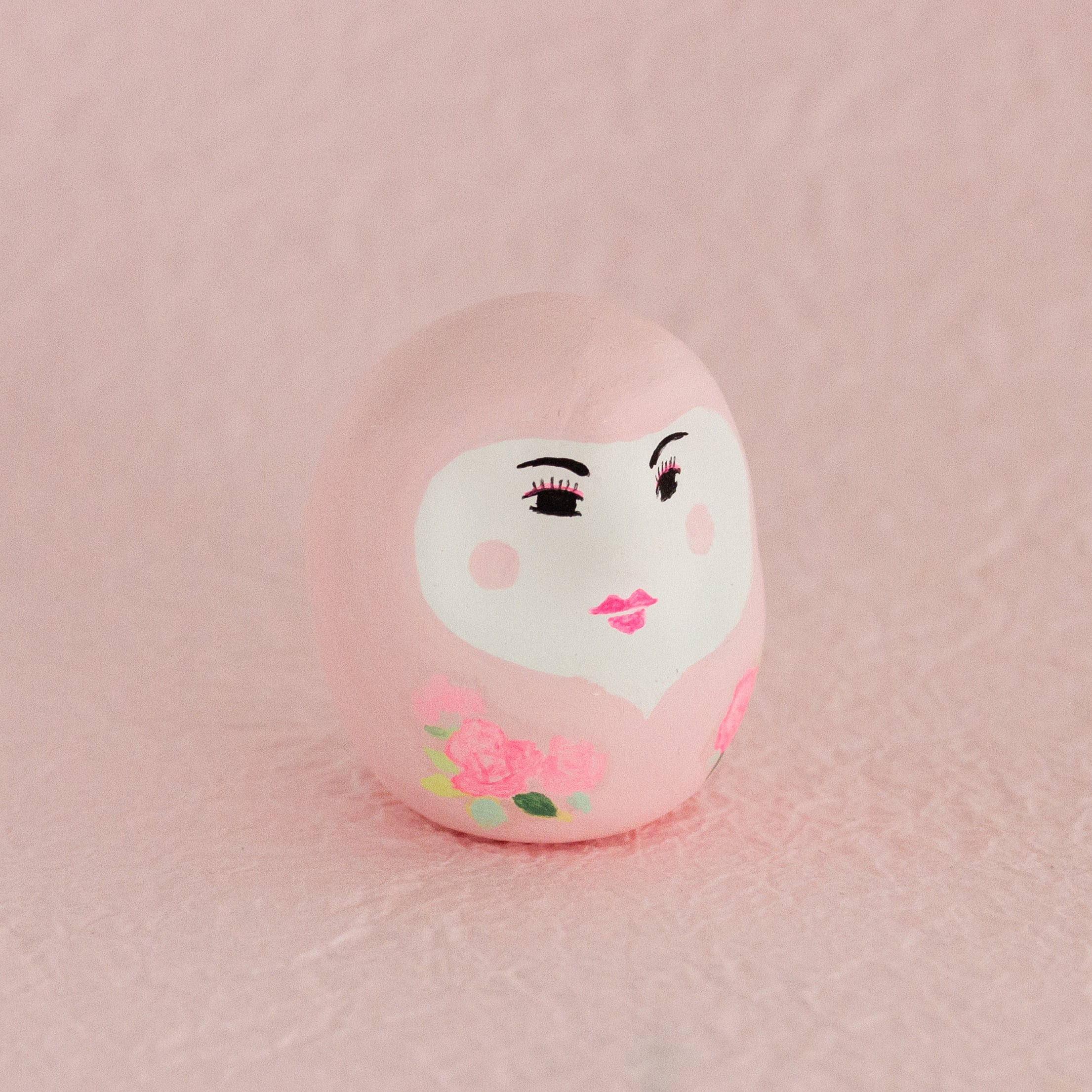 パステルピンクにローズで飾られた華やかな癒しだるまです。